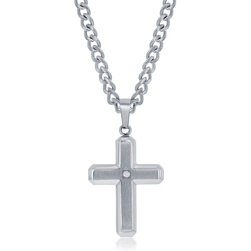 Delivers a sleek and masculine look that blends spiritual symbolism with contemporary sophistication with this men’s cross necklace is crafted in sturdy stainless steel with a unique mix of brushed and polished textures. Highlighted by a single cubic zirconia, it offers a refined touch of brilliance, merging spiritual significance with understated luxury.